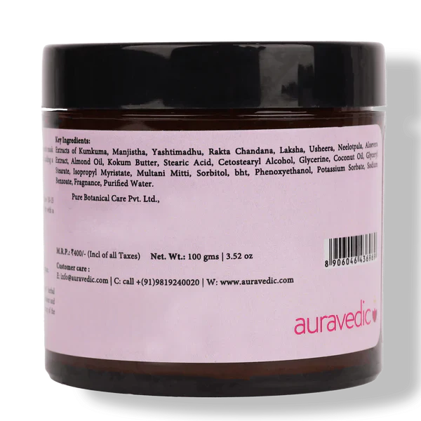 - Extracts of Kumkuma, Manjistha, Yashtimadhu, Rakta Chandana, Laksha, Usheera, Neelotpala, Aloevera Extract, Almond Oil, Kokum Butter, Stearic Acid, Cetostearyl Alcohol, Glycerine, Coconut Oil, Glyceryl Stearate, Isopropyl Myristate, Multani Mitti, Sorbitol, Bht, Phenoxyethanol, Potassium Sorbate, Sodium, Benzoate, Fragnance, Puried Water