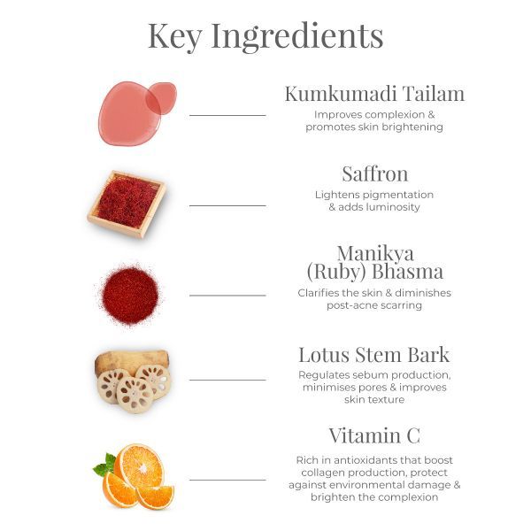 - Kumkumadi Night cream is specially designed with powerful Ayurvedic ingredients includuing Manikya Bhasma or precious Ruby gemstone paste, which helps to lighten pigmentation, clarify the skin and heal acne scars.