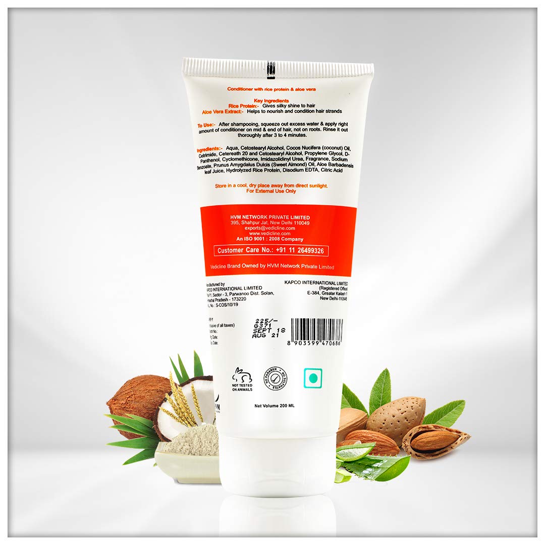 - Vedicline Conditioner with Rice protein & Aloe Vera nourishes the scalp and keeps hair healthy, bouncy and shiny, even when it's dry and dull also assists in the recovery of the scalp.