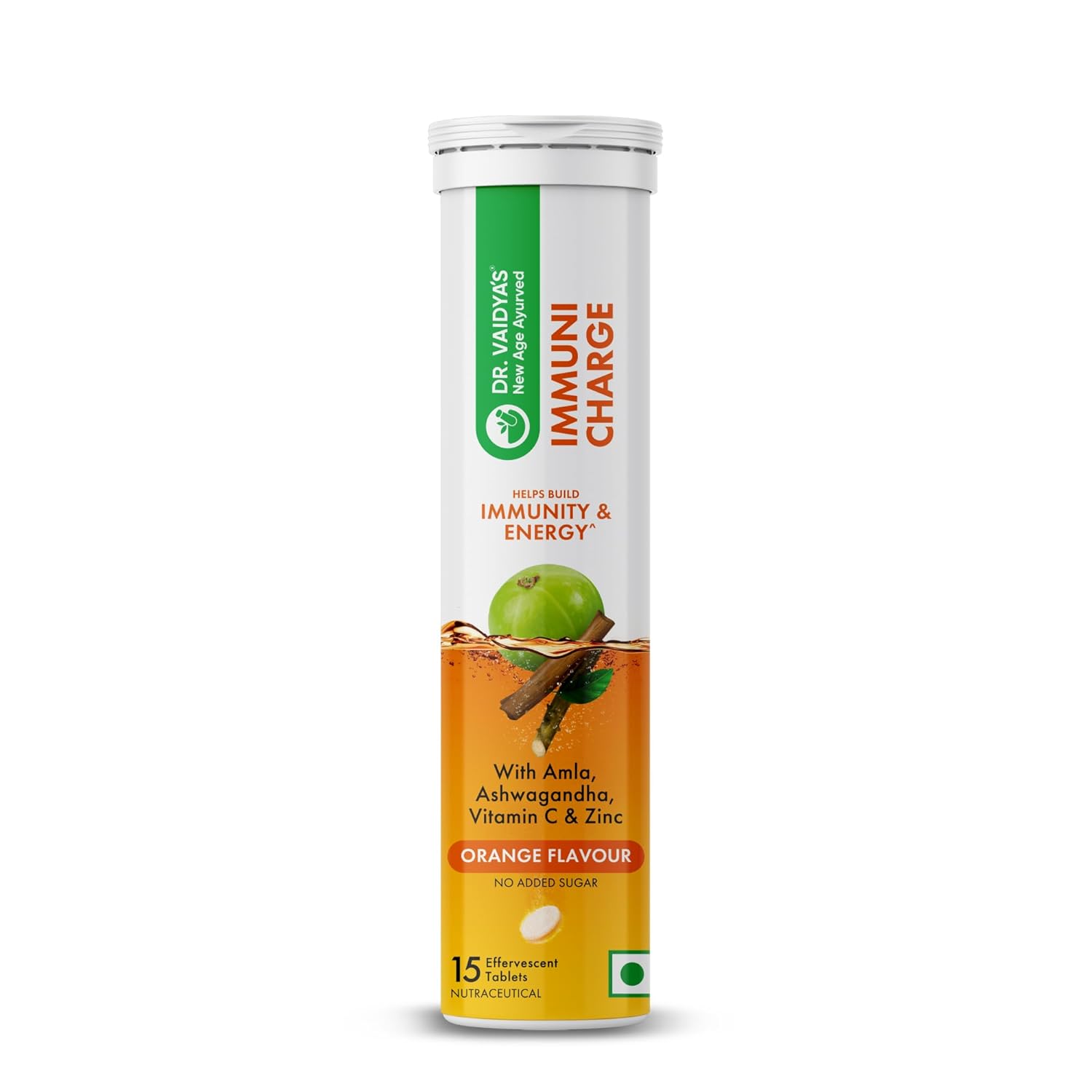 - Dr.Vaidya's Immuni Charge Effervescent Tablet Time to supercharge your immunity is now with Dr. Vaidya’s immuni charge. It comes in an effervescent form that is easy to carry and consume. Just pop open the immuni charge, drop it in a glass of water, let it dissolve, and relish the flavoursome drink. Dr. Vaidya’s immuni charge is made with 11 natural herbs that contain amla, ashwagandha, vitamin C, zinc, mulethi, etc. These ingredients help boost immune cell production in the body and help in fighting off germs and bacteria. It has no known side effects and does not contain any added sugar. For best results, take 1 tablet twice a day for 3 months before meals. It is made with a richness of 11 natural extracts, amla extract contains antioxidants that help boost immunity, mulethi extract assists in flushing out toxins to help keep the gut healthy, ashwagandha extract - helps reduce stress, boosts your immunity, and pumps up the daily energy levels in the body. Vitamin C and zinc assist in strengthening the immune system and lastly giloy extract - assists in boosting immunity and protects you from bacteria, flu, and seasonal infections.