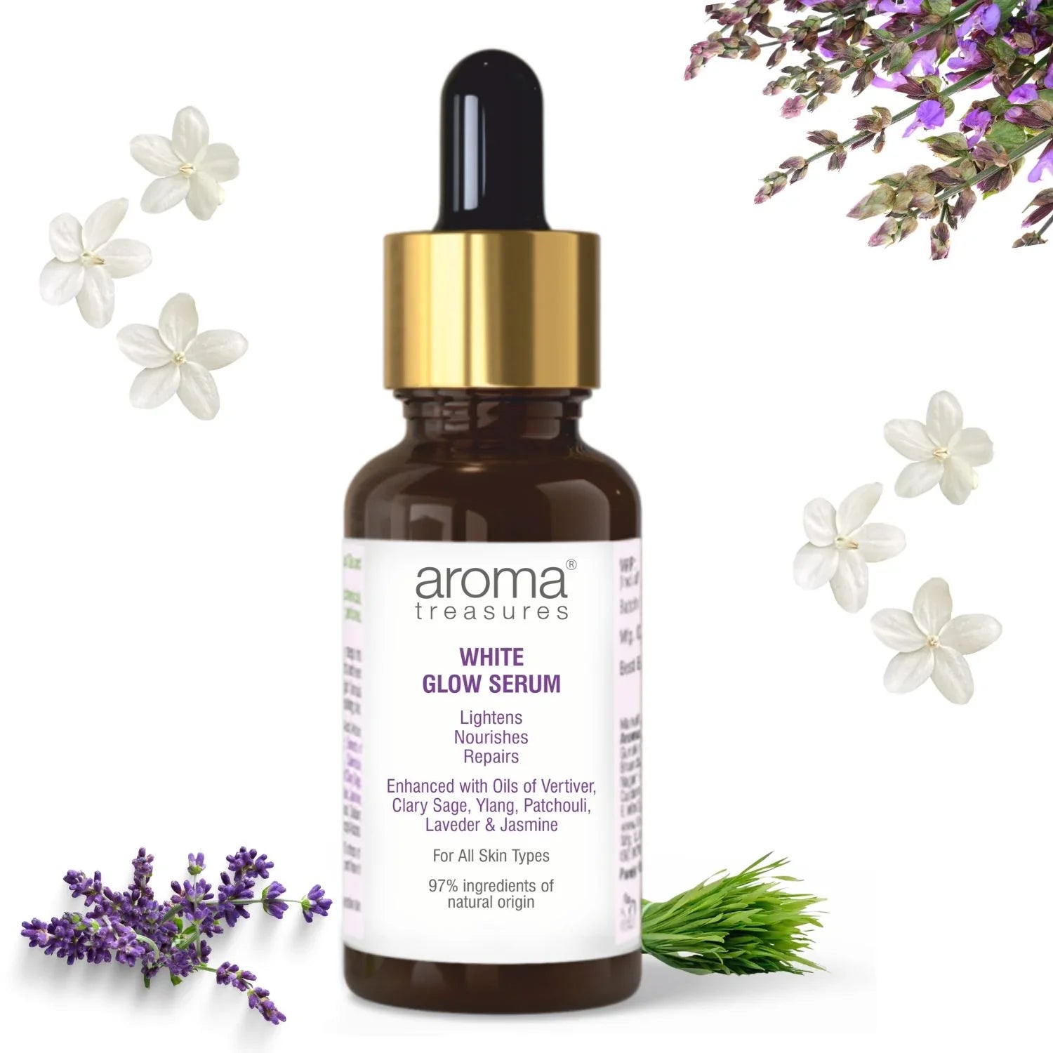 - Repel the wear and tear your skin endures with the white glow serum that instantly seeps into your skin to undo daily damage. It will even out patchy skin and nourish deeply and leave you with a rosy-cheeked tinge. Vertivert oil fades lines and wrinkles while jasmine oil soothes and relieves sensitive skin and heals skin irritations. Clary sage has bactericidal and antiseptic properties that are ideal for treating acne-prone skin and pimples. Patchouli tightens open pores and reduces scars and blemishes, restoring radiant complexion. Ylang ylang balances sebum production while hydrating and nourishing the skin. Lavender oil treats damaged skin and fades pigmentation, restoring moisture and leading to lively skin.