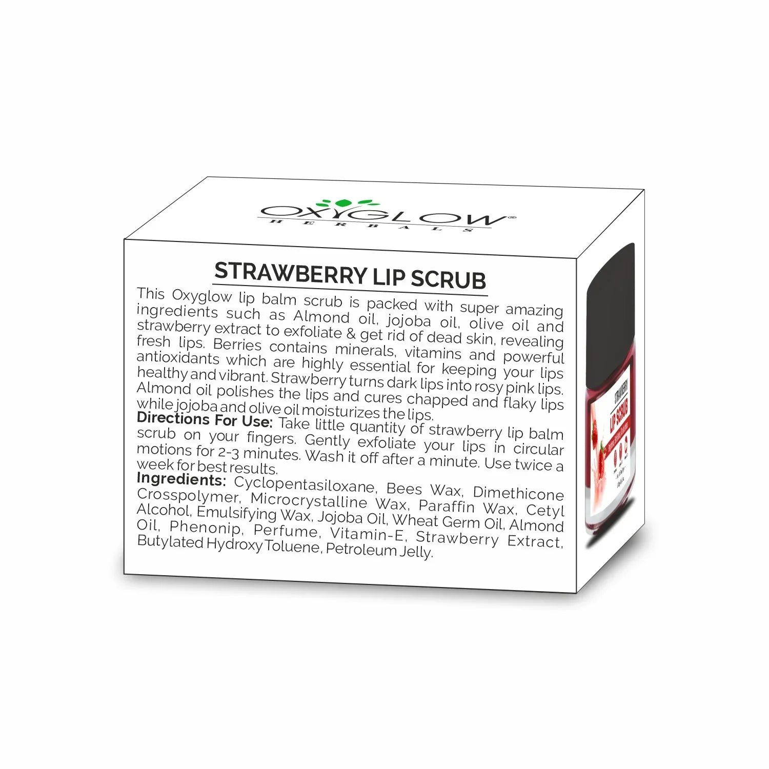 - OxyGlow Strawberry Lip Balm Scrub is packed with super amazing ingredients such as almond oil, jojoba oil, olive oil and strawberry extract to exfoliate & get rid of dead skin, revealing fresh lips.