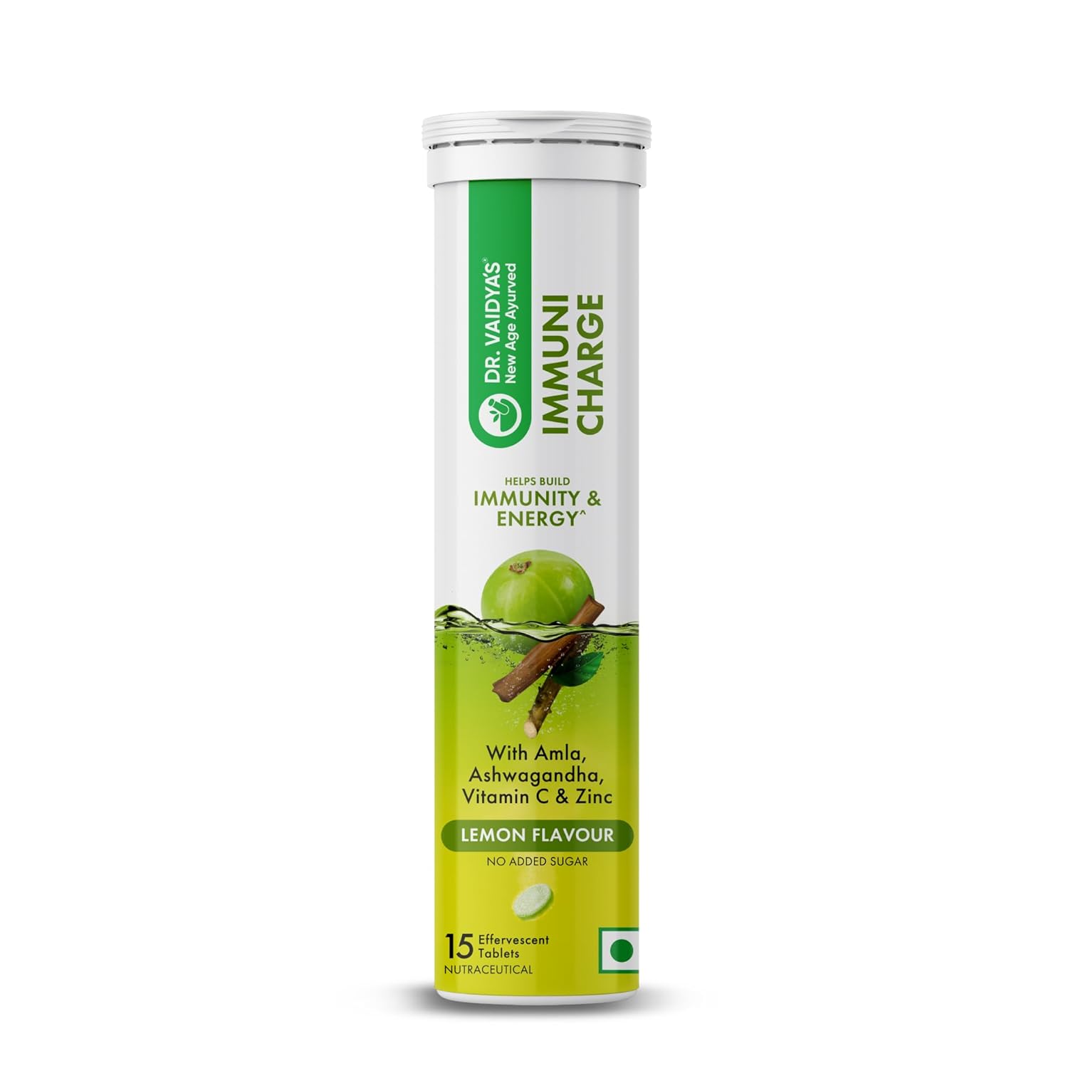 - Dr.Vaidya's Immuni Charge Effervescent Tablet Time to supercharge your immunity is now with Dr. Vaidya’s immuni charge. It comes in an effervescent form that is easy to carry and consume. Just pop open the immuni charge, drop it in a glass of water, let it dissolve, and relish the flavoursome drink. Dr. Vaidya’s immuni charge is made with 11 natural herbs that contain amla, ashwagandha, vitamin C, zinc, mulethi, etc. These ingredients help boost immune cell production in the body and help in fighting off germs and bacteria. It has no known side effects and does not contain any added sugar. For best results, take 1 tablet twice a day for 3 months before meals. It is made with a richness of 11 natural extracts, amla extract contains antioxidants that help boost immunity, mulethi extract assists in flushing out toxins to help keep the gut healthy, ashwagandha extract - helps reduce stress, boosts your immunity, and pumps up the daily energy levels in the body. Vitamin C and zinc assist in strengthening the immune system and lastly giloy extract - assists in boosting immunity and protects you from bacteria, flu, and seasonal infections.