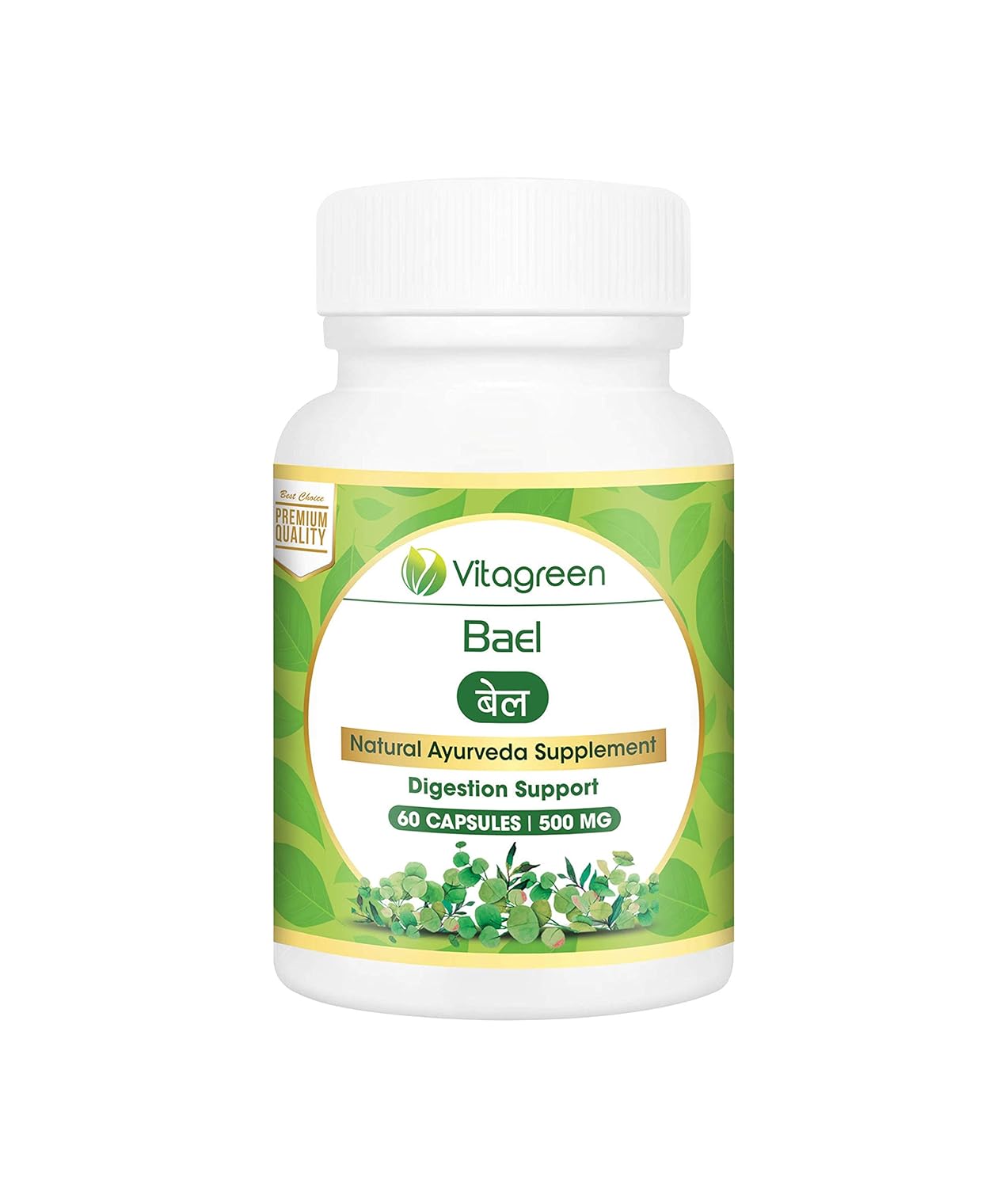 - Vitagreen Bael 500mg Capsule has antibacterial properties and benefits digestion and inflammation. It can keep your skin healthy and may help lower cholesterol levels in the blood. It is also helpful in relieving acidity or constipation.