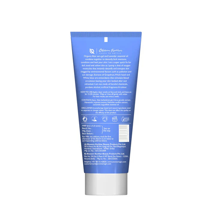 - I am 100% free of parabens, harsh chemicals, alcohol, artificial fragrance, and color. Organic aloe vera gel and lavender essential oil combine together to detoxify, lock moisture, condition, and heal your skin. I am a super quick fix for dull, tired, and sallow skin as I pump a shot of oxygen molecules that instantly detoxify and energize skin clogged by environmental factors such as pollution and sun damage. Extracts of grapefruit, witch hazel, and white lotus are antioxidants that stimulate blood circulation leaving your skin looked after and refreshed.