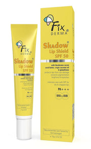 - Fixderma Shadow Lip Shield SPF 50 is formulated with the goodness of cocoa butter, shea butter, vitamin E, and glutathione, which help to brighten your darkened lips and heal and nourish chapped and dry lips. This lip balm with SPF creates a protective layer on the lips to prevent further darkening and sun damage. It keeps lips hydrated and sun protected for a long time.